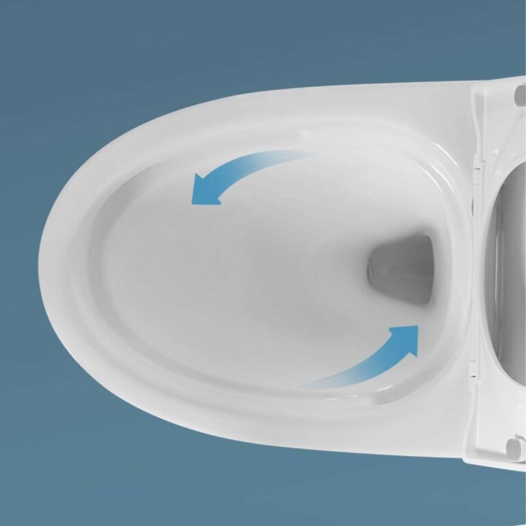 Hệ thống xả xoáy kép 360 độ, sử dụng 2 tia nước chảy xuống từ thành cầu Với 2 tia nước cực mạnh tạo thành một dòng xoáy đều giúp khắc phục âm thanh xả nước so với các bàn cầu thông thường và vẫn đảm bảo xả sạch, dòng nước xoáy đều trong lòng bàn cầu cùng với áp lực nước được duy trì ổn định giúp vệ sinh sạch sẽ khu vực chất thải tích tụ dễ dàng nhất, Nó còn sử dụng ít nước hơn. Lực xả mạnh mẽ tiếp cận đến từng inch của bồn cầu, tạo ra một luồng nước xoáy mạnh kết hợp với lực của nước để làm sạch hoàn toàn.