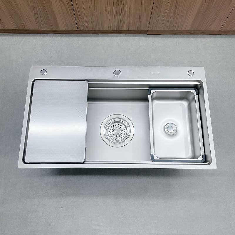 Về kích thước, S750HQD có kích thước phủ bì: 750*460*H230 và kích thước lọt lòng 710*340. Với kích thước này, sản phẩm sẽ là một lựa chọn hoàn hảo cho các gia chủ muốn tối ưu không gian lắp đặt. S750HQD được trang bị thêm một chậu nhỏ cùng một giá tiện lợi để đựng miếng rửa chén, giáp sắt cọ nồi khi không sử dụng.